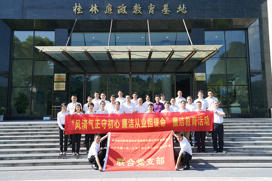 為進一步增強桂林市紀檢監(jiān)察綜合業(yè)務基地建設工作的光榮感、使命感和成就感,7月31日上午,市紀委、市監(jiān)委特別安排基地主要參建單位中共桂林新城投資開發(fā)集團有限公司支部委員會、中共中建八局二公司廣西公司桂林區(qū)域支部委員會聯(lián)合黨支部參觀了桂林廉政教育基地,開展了一項“風清氣正守初心 廉潔從業(yè)擔使命”廉潔教育活動。