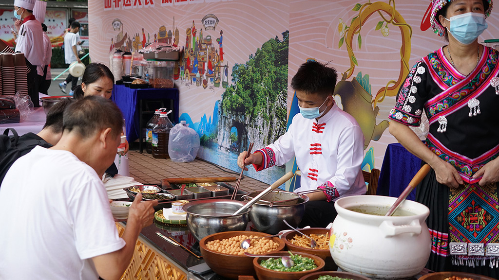 活動(dòng)現(xiàn)場(chǎng),“品非遺美食,游桂林山水”的主題引人入勝,桂林米粉、恭城油茶“非遺”文化展示及品嘗等活動(dòng)精彩紛呈。為確?;顒?dòng)的順利進(jìn)行,宏謀酒管公司迅速組織了20名一線工作者,他們不懼烈日高溫,全心全意地投入到工作中。盡管汗水浸透了他們的衣衫,但他們始終保持著飽滿的熱情和專注,為新生們提供了優(yōu)質(zhì)的服務(wù)?;顒?dòng)現(xiàn)場(chǎng)氛圍火爆,總計(jì)供應(yīng)了2000碗米粉以及1500碗油茶,為初來(lái)乍到新生和家長(zhǎng)們帶來(lái)了一場(chǎng)別具特色的美食文化盛宴。
