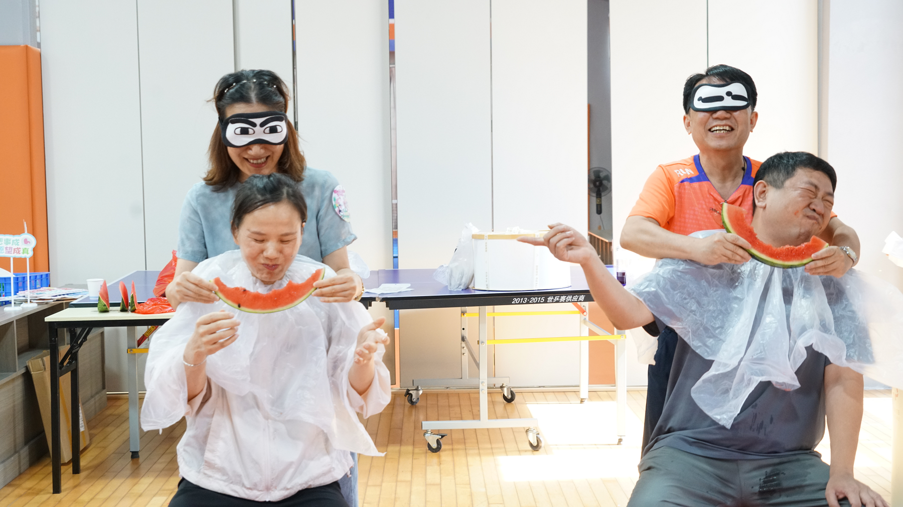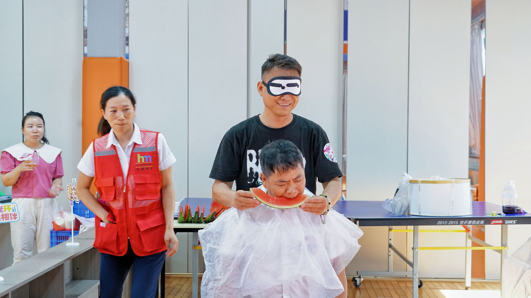 而“蒙眼吃西瓜”更是將歡樂氛圍拉滿,蒙著眼的壽星們摸索著尋找西瓜,狼吞虎咽的樣子既可愛又搞笑。