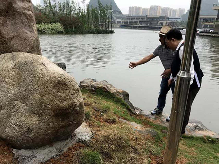 緊接著,檢查組冒雨檢查臨桂新區(qū)橋梁標(biāo)識(shí)石的牢固情況。在現(xiàn)場(chǎng)聽(tīng)取施工人員的介紹后,檢查組提出進(jìn)入雨季后,降雨頻繁,要適時(shí)加強(qiáng)對(duì)橋梁標(biāo)識(shí)石的沉降觀察,以確?;A(chǔ)的安全、穩(wěn)固。