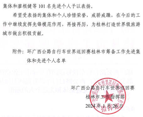 近日,根據(jù)《環(huán)廣西公路自行車世界巡回賽桂林市工作指揮部關(guān)于表揚(yáng)環(huán)廣西公路自行車世界巡回賽桂林市籌備工作先進(jìn)集體和先進(jìn)個(gè)人的通報(bào)》(市環(huán)指[2024]1號(hào))獲悉,新城投集團(tuán)下屬宏謀物業(yè)公司李楓彥同志獲環(huán)廣西公路自行車世界巡回賽桂林市籌備工作先進(jìn)個(gè)人。