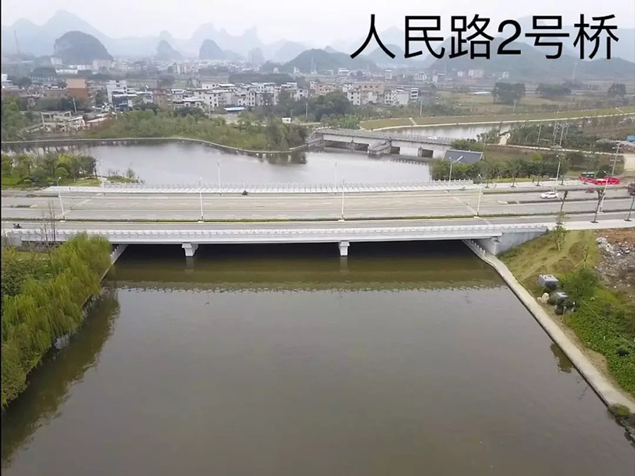 人民路二號(hào)橋位于臨桂新區(qū)人民路(萬(wàn)福路-臨雁路段)上,是臨桂區(qū)通往秧塘工業(yè)園區(qū)的重要通道,橋梁結(jié)構(gòu)采用32米+32米+32米三跨等截面連續(xù)結(jié)構(gòu),跨越臨桂新區(qū)規(guī)劃水系,橋梁中心線(xiàn)與河道正交,橋梁長(zhǎng)度為102.2米、寬度為40米,該工程于2017年5月開(kāi)工建設(shè),于2018年6月21日完成初步驗(yàn)收。